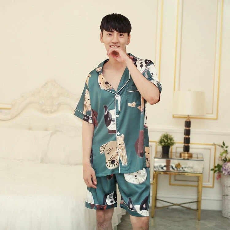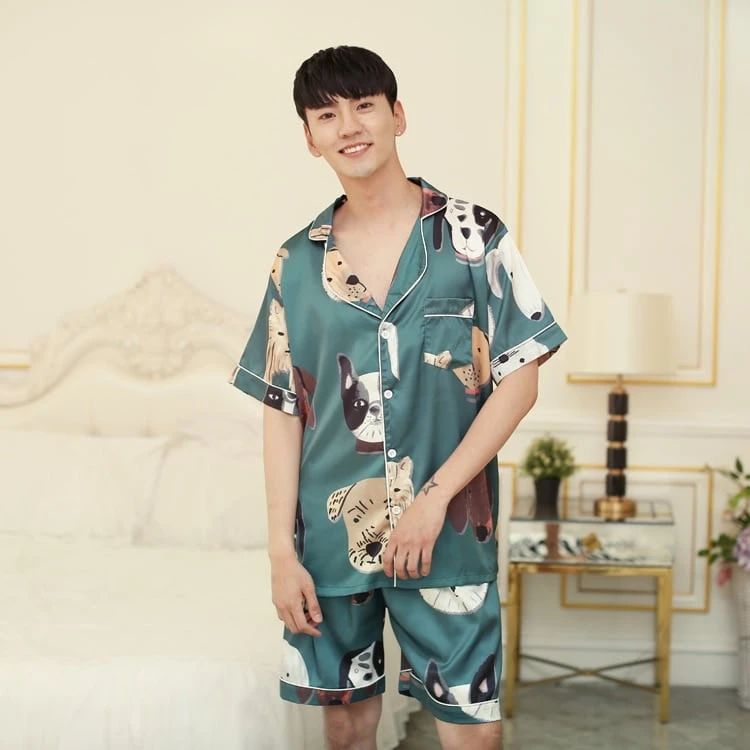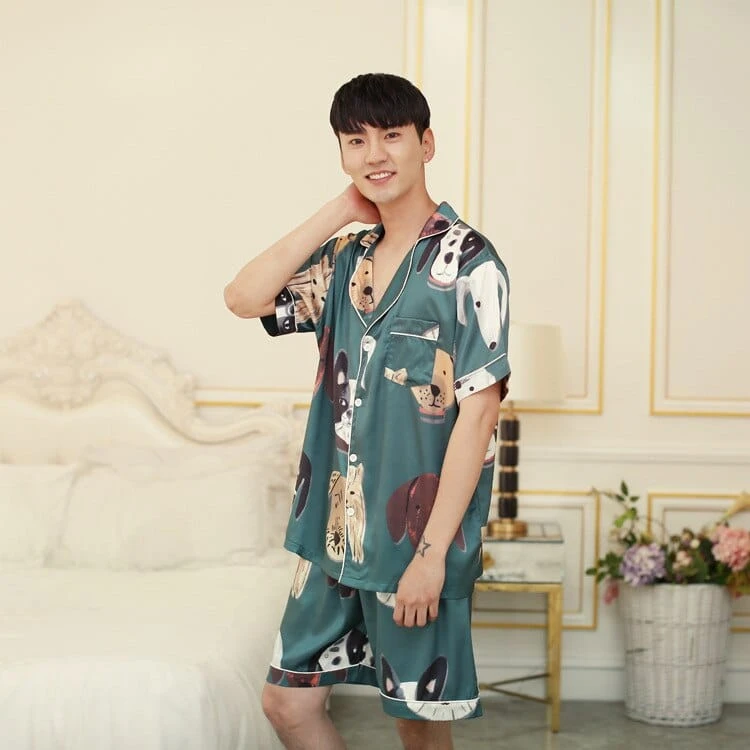 Pyjama Automne Deux Pièces Vert Foncé En Satin à Motif Chiens