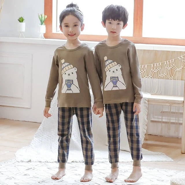 Pyjama Printemps Avec Pull-over Beige Et Pantalon Carreaux Pour Enfants